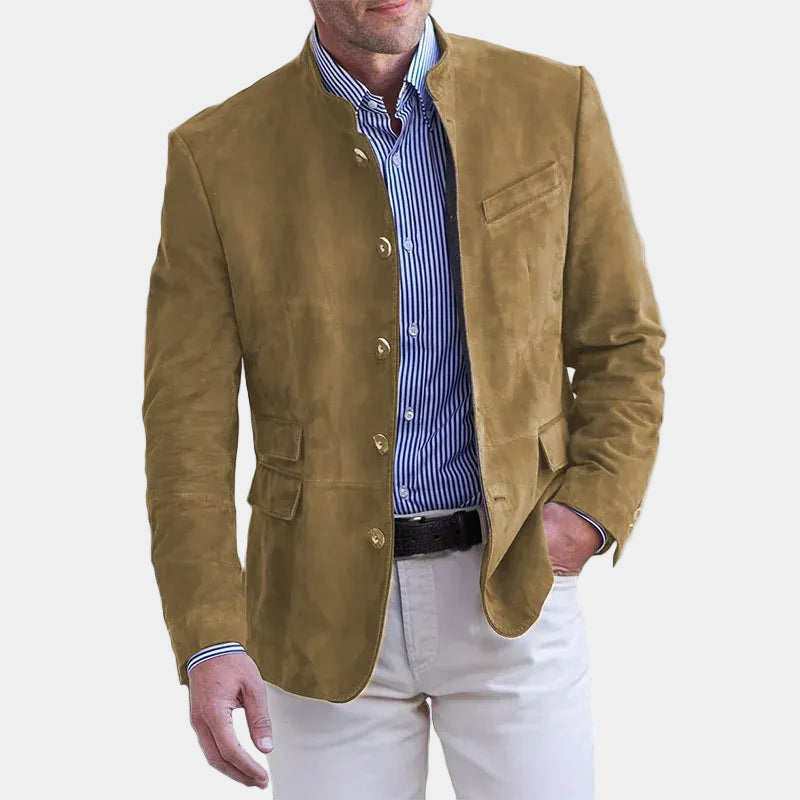 Wil je een blazer met een unieke afwerking? Deze suède blazer voor heren heeft een...