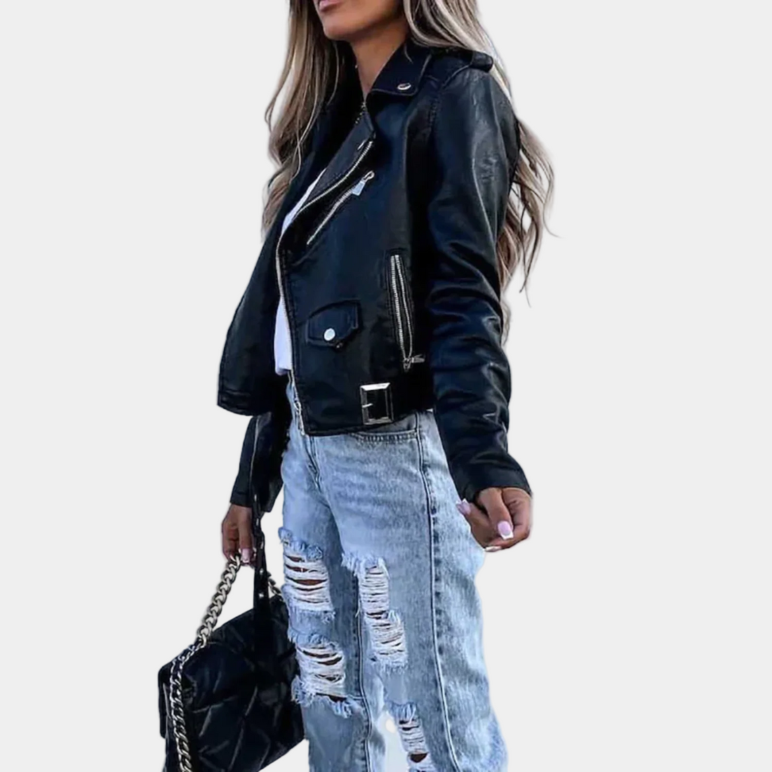 Deze korte leren jas voor dames heeft een getailleerde pasvorm en een kortere lengte, wat...