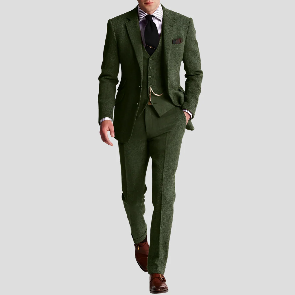 Dit driedelig pak is gemaakt voor heren die een klassiek en robuust pak zoeken met veel structuur. De set bestaat uit een colbert, een gilet en een pantalon, allemaal gemaakt van tweed-stof. De tweed stof is dik en geweven, wat een opvallende en stevige structuur geeft. Dit pak is ideaal voor de koude maanden.