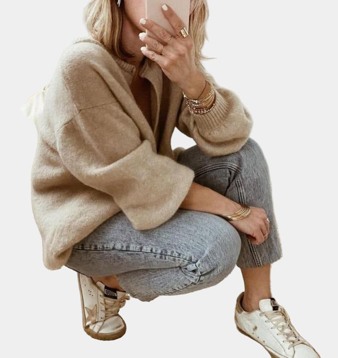 Deze gebreide cardigan is ontworpen voor dames die een zacht en veelzijdig vest zoeken. De cardigan heeft een nette ronde hals en een volledige knoopsluiting. Het gebreide materiaal voelt zacht aan en houdt je comfortabel warm. Dit item is perfect om over een top of blouse te dragen voor extra warmte.