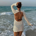Deze korte strandjurk is gemaakt van een fijn gehaakte stof met gaatjes. De jurk heeft lange mouwen die wijd uitlopen en een mooie open rug met een strikje, wat zorgt voor een echte zomerse look.
