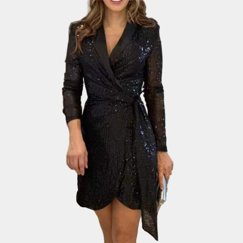 Deze Glitter Blazer Jurk is gemaakt voor dames die een feestelijke, opvallende en elegante jurk zoeken. De jurk is gemaakt van een glitterstof die opvalt en mooi schittert. De jurk heeft de nette snit van een blazer,Β met een diepe V-hals. Dit item is perfect voor feestjes en gala's.