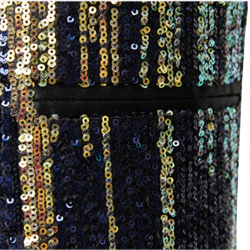 Dit Glitter Colbert met Sjawlkraag is gemaakt voor heren die een luxe en opvallende uitstraling willen op feesten. Het Colbert is gemaakt van een glanzende stof met fijne glitters die schittert in het licht. De Sjawlkraag is van satijn en geeft een zeer nette en elegante afwerking. De pasvorm zorgt voor een strak silhouet. Dit Heren Colbert is perfect voor gala's, chique diners of de feestdagen.