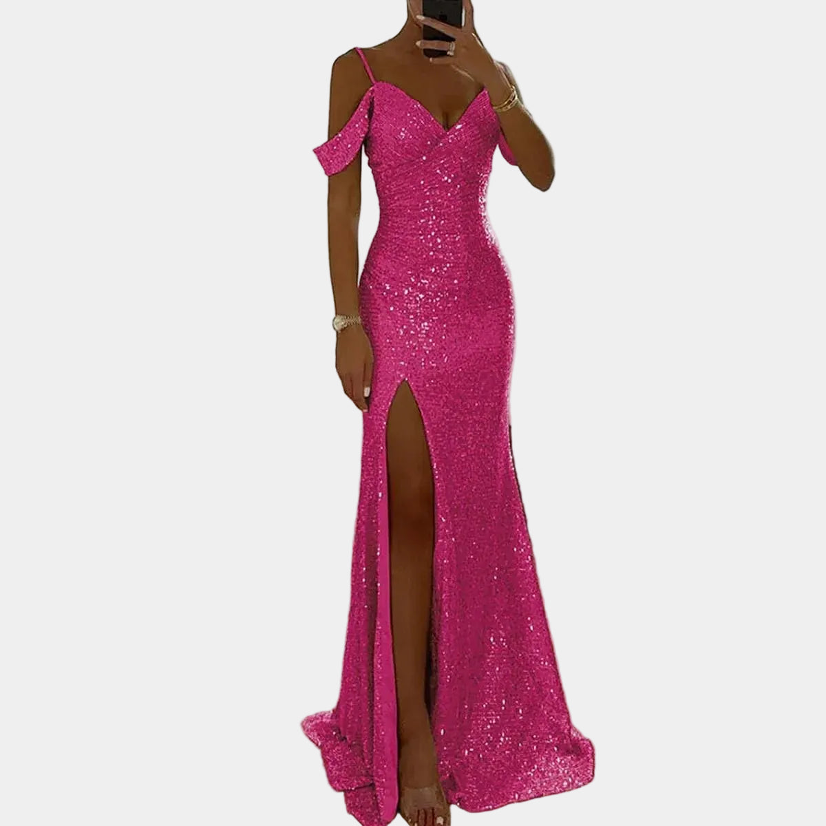 Deze Glitter Galajurk is gemaakt voor dames die een opvallende en elegante look zoeken voor feesten. De jurk is gemaakt van een soepele stof met glitters die mooi schittert als je beweegt. De jurk heeft een nauwsluitende pasvorm en eenΒ Hoge Split in de rok, wat zorgt voor een mooie uitstraling. De glitterstof en de nette snit maken deze Dames Jurk perfect voor gala's, chique feesten en speciale avonden.