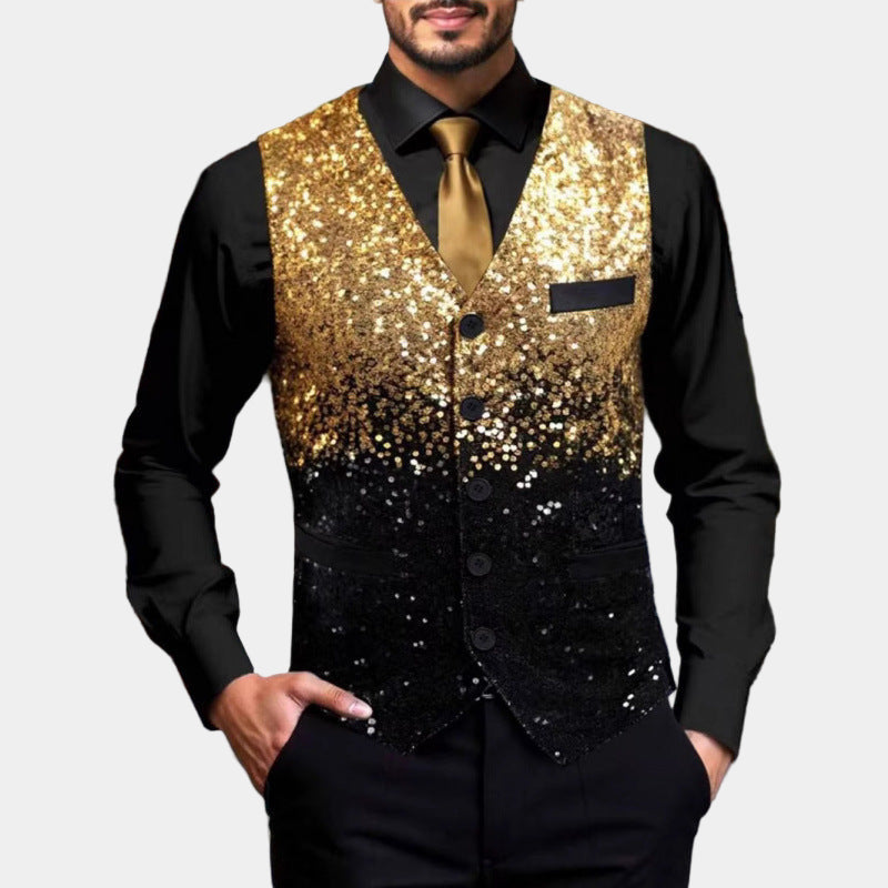 Feestelijke Glitterstof: Zorgt ervoor dat het gilet opvalt onder een colbert.