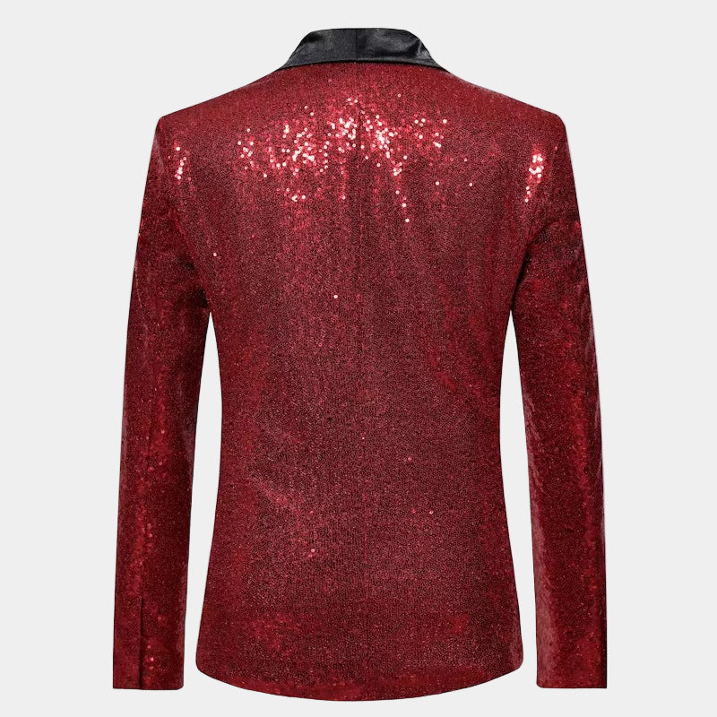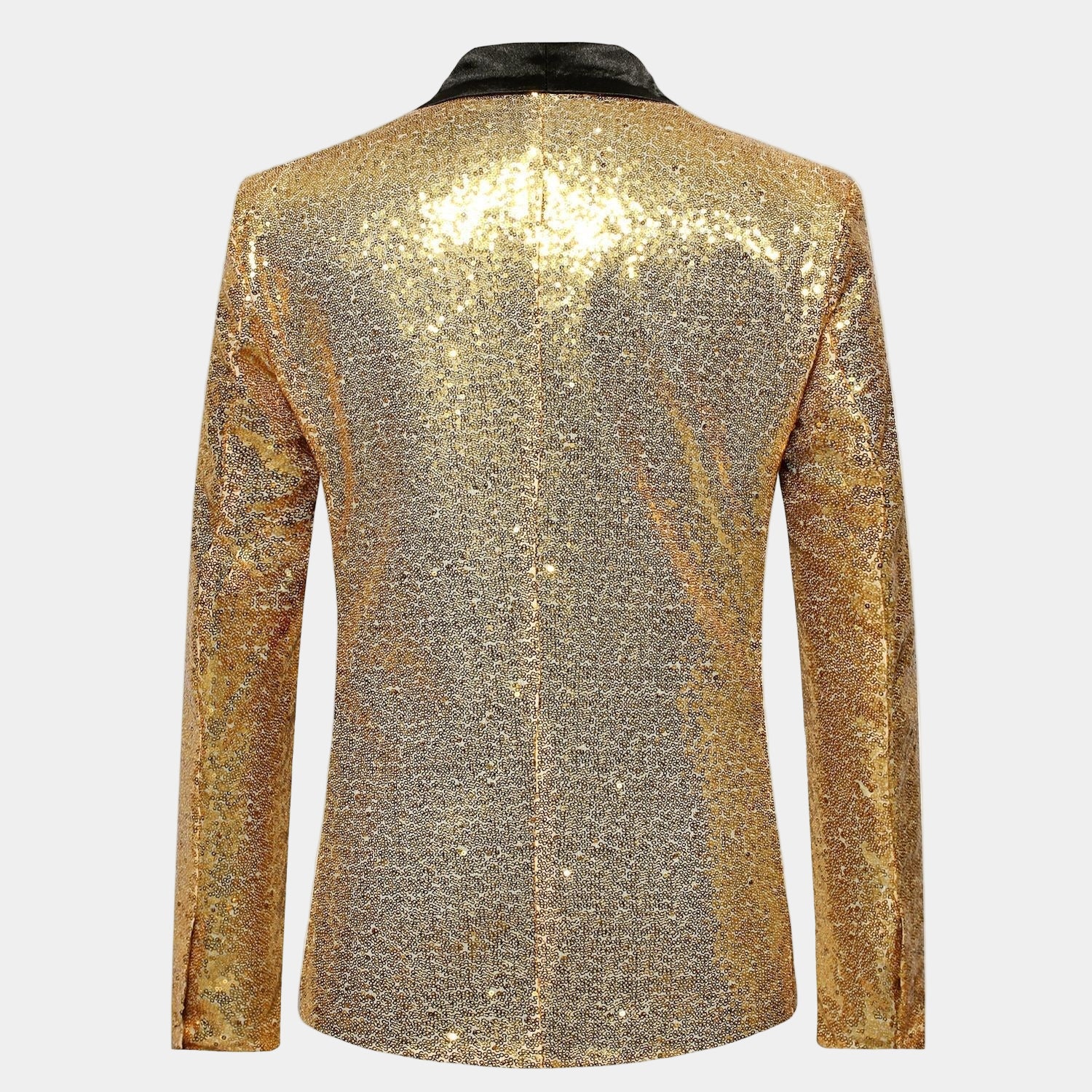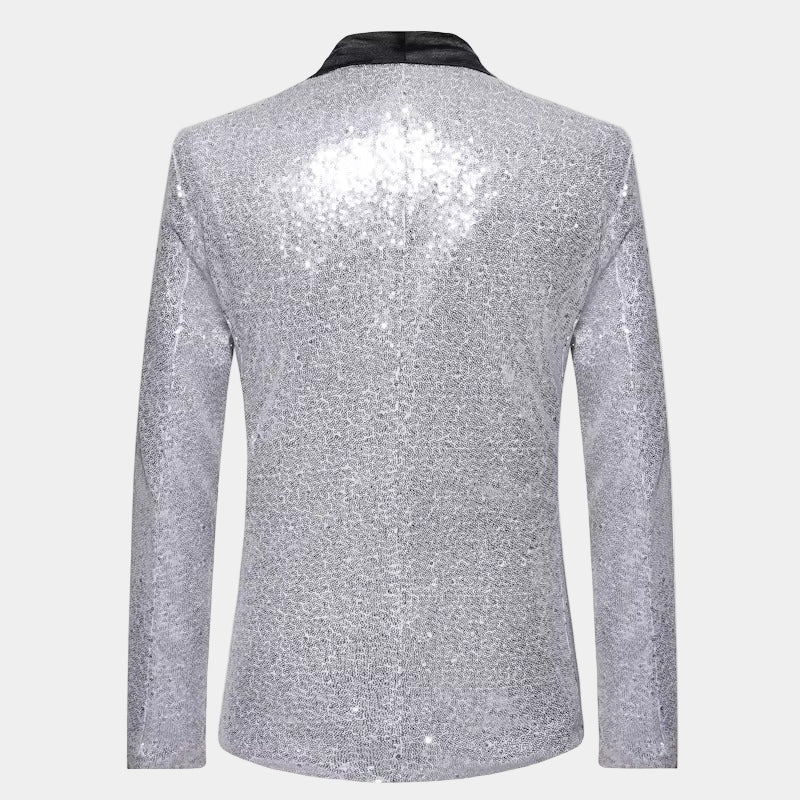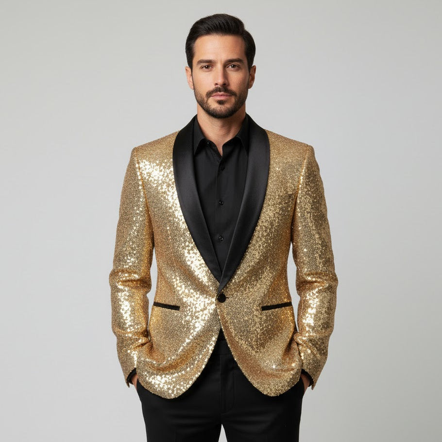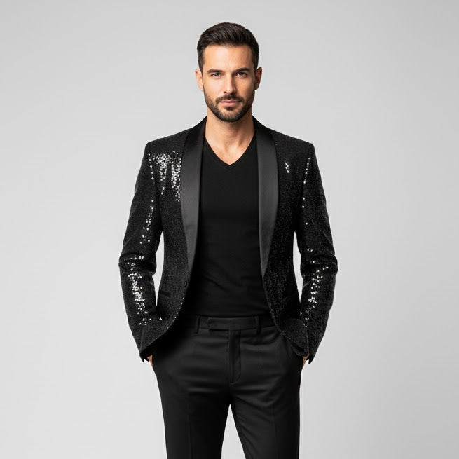 Dit Glitter Jasje in Smokingstijl is ontworpen voor heren die een opvallende en feestelijke look nodig hebben voor speciale avonden. Het jasje is gemaakt van een glanzende stof met fijne glittersΒ die mooi schittert in het licht. De Smokingstijl kenmerkt zich door een nette reverskraag en een strakke, moderne pasvorm. DitΒ Heren Jasje is perfect om te combineren met een nette zwarte broek voor gala's, feesten of de feestdagen, en zorgt ervoor dat je direct opvalt.
