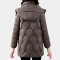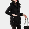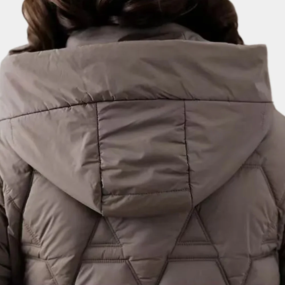 Deze halflange gewatteerde jas is ontworpen voor dames die een warme en vrouwelijke jas met goede bedekking zoeken. De jas valt tot over de heupen en is gewatteerd met een lichte taille om een mooie vorm te behouden. De capuchon is praktisch voor bescherming tegen wind en neerslag. De lengte zorgt voor extra warmte en bedekking van de rug en heupen.