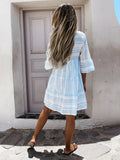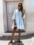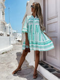 Deze boho jurk voor dames is voorzien van een uniek geometrisch en bloemig patroon dat zorgt voor een frisse en zomerse uitstraling. Het kledingstuk heeft een losse pasvorm met verschillende banen in de rok, waardoor de stof soepel meebeweegt tijdens het lopen. De blousekraag met een subtiele knoopsluiting aan de voorzijde geeft de jurk een verzorgde finish, terwijl de driekwart mouwen met ruches extra bewegingsvrijheid bieden. Het materiaal is uitermate geschikt voor warme dagen waarop je behoefte hebt aan een luchtige kledingkeuze. Dankzij de knielengte is de jurk veelzijdig te combineren en behoudt het een tijdloze charme voor verschillende gelegenheden. Dit product is ideaal voor strandwandelingen, vakanties en informele zomerse bijeenkomsten.