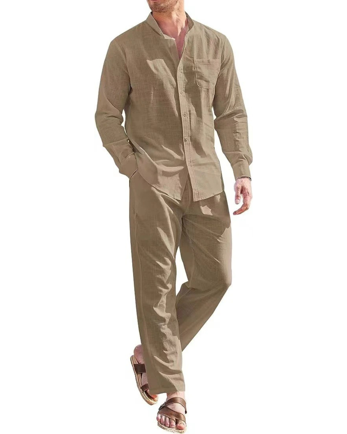 Deze linnen set voor heren is vervaardigd uit een luchtige stof die zorgt voor ventilatie tijdens warme dagen. De set bestaat uit een shirt met lange mouwen en een bijpassende broek, beide met een ontspannen pasvorm die zorgt voor een zorgeloze uitstraling en optimale bewegingsvrijheid. Het shirt is voorzien van een stijlvolle opstaande kraag en een praktische borstzak, terwijl de broek een snit heeft die perfect aansluit bij een nonchalante stijl. De textuur van het materiaal maakt deze outfit ideaal voor ontspannen momenten of zomerse activiteiten. Je combineert deze set moeiteloos met sandalen of slippers voor een complete en frisse look. Dit kledingstuk is ideaal voor vakanties, strandwandelingen, een informele lunch of dagelijks gebruik.