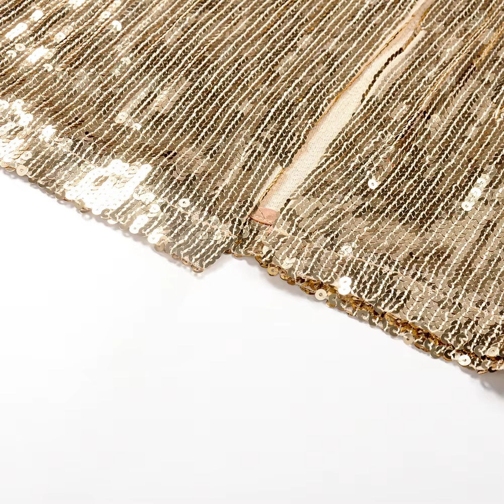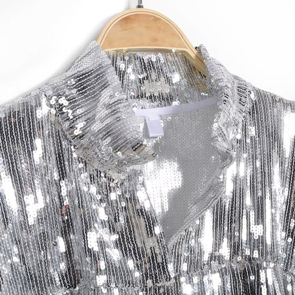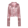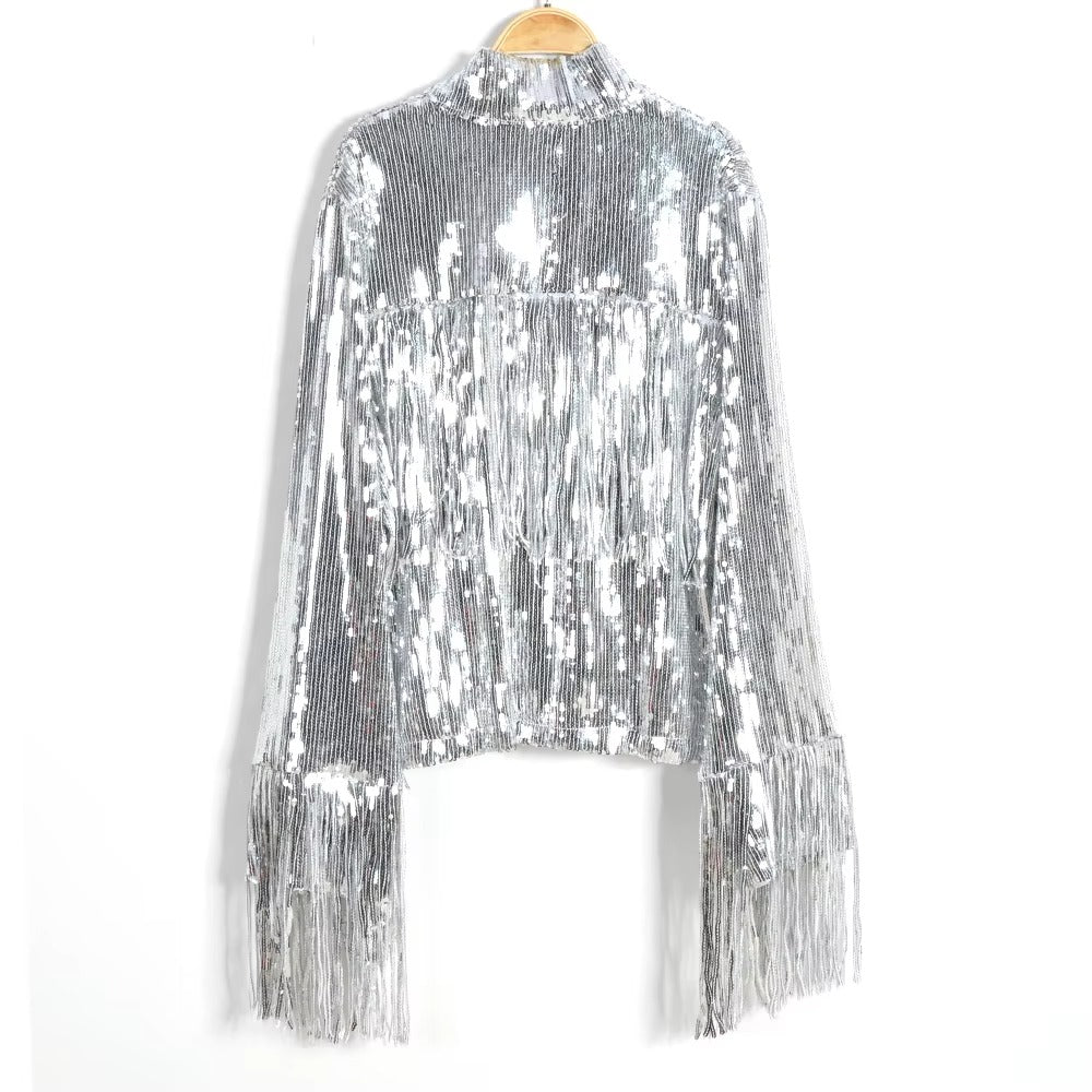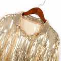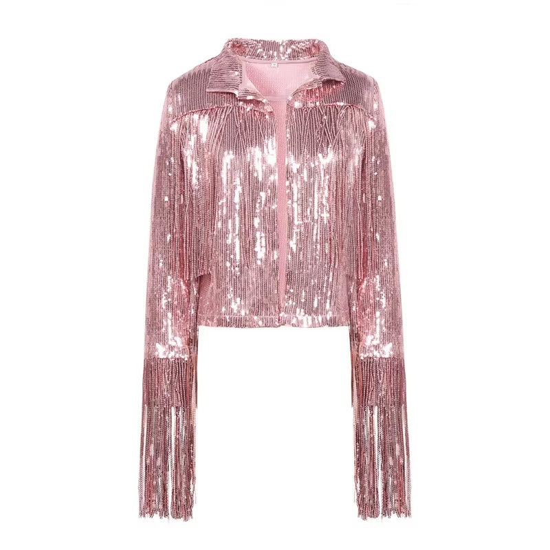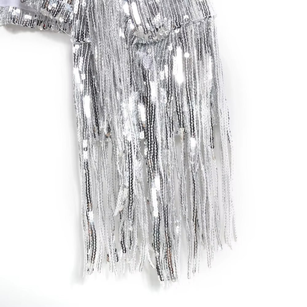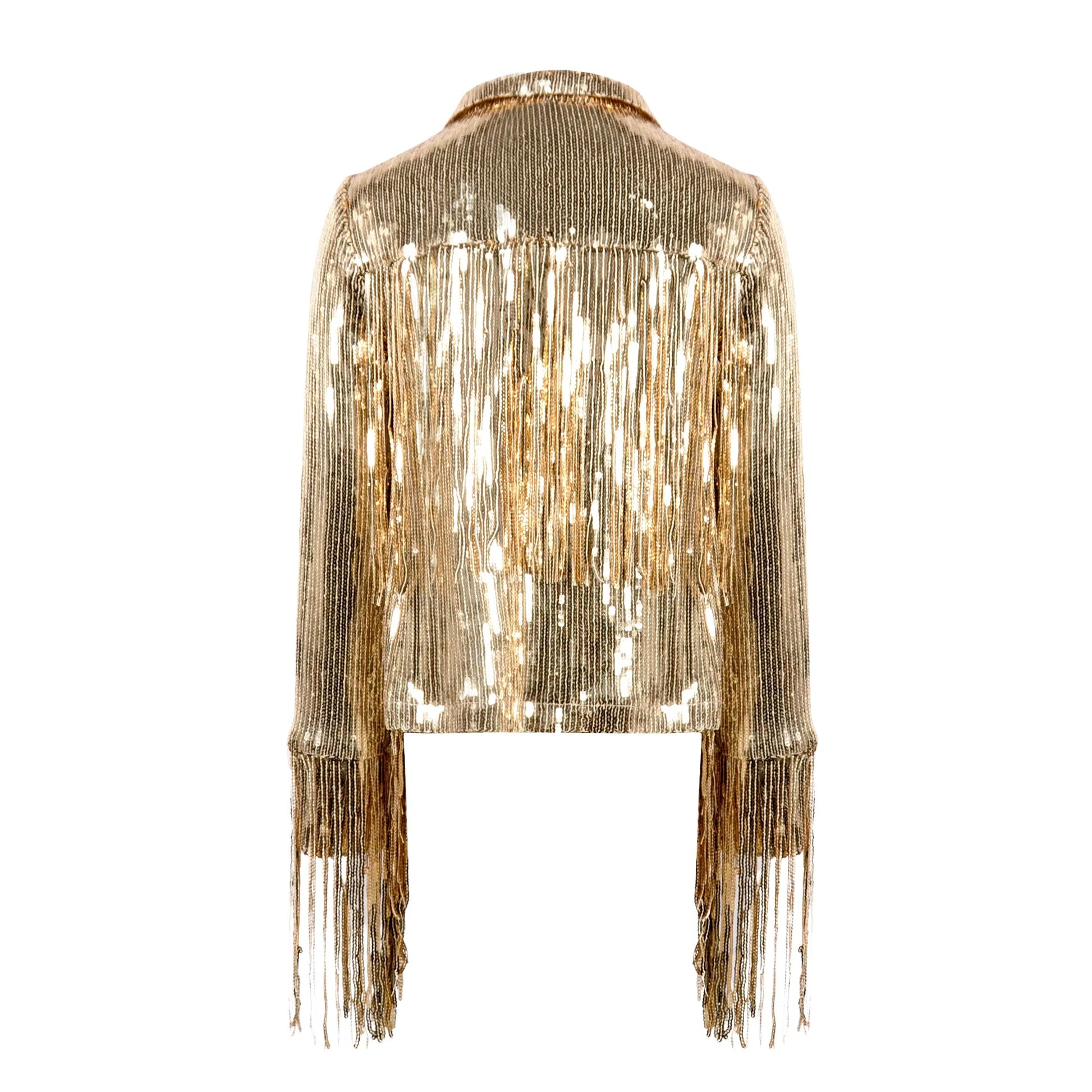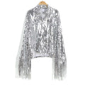 Dit Pailletten Jasje met Franje Mouwen is ontworpen voor dames die een speelse en opvallende look zoeken voor een feest. Het jasje is bedekt met glimmende Pailletten en is afgewerkt met FranjeΒ aan de mouwen. De franje beweegt speels mee. Dit Dames Jasje is perfect om over een top of jurk te dragen en is ideaal voor dansfeesten, clubs of festivals, en zorgt voor een dynamische en feestelijke uitstraling.