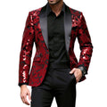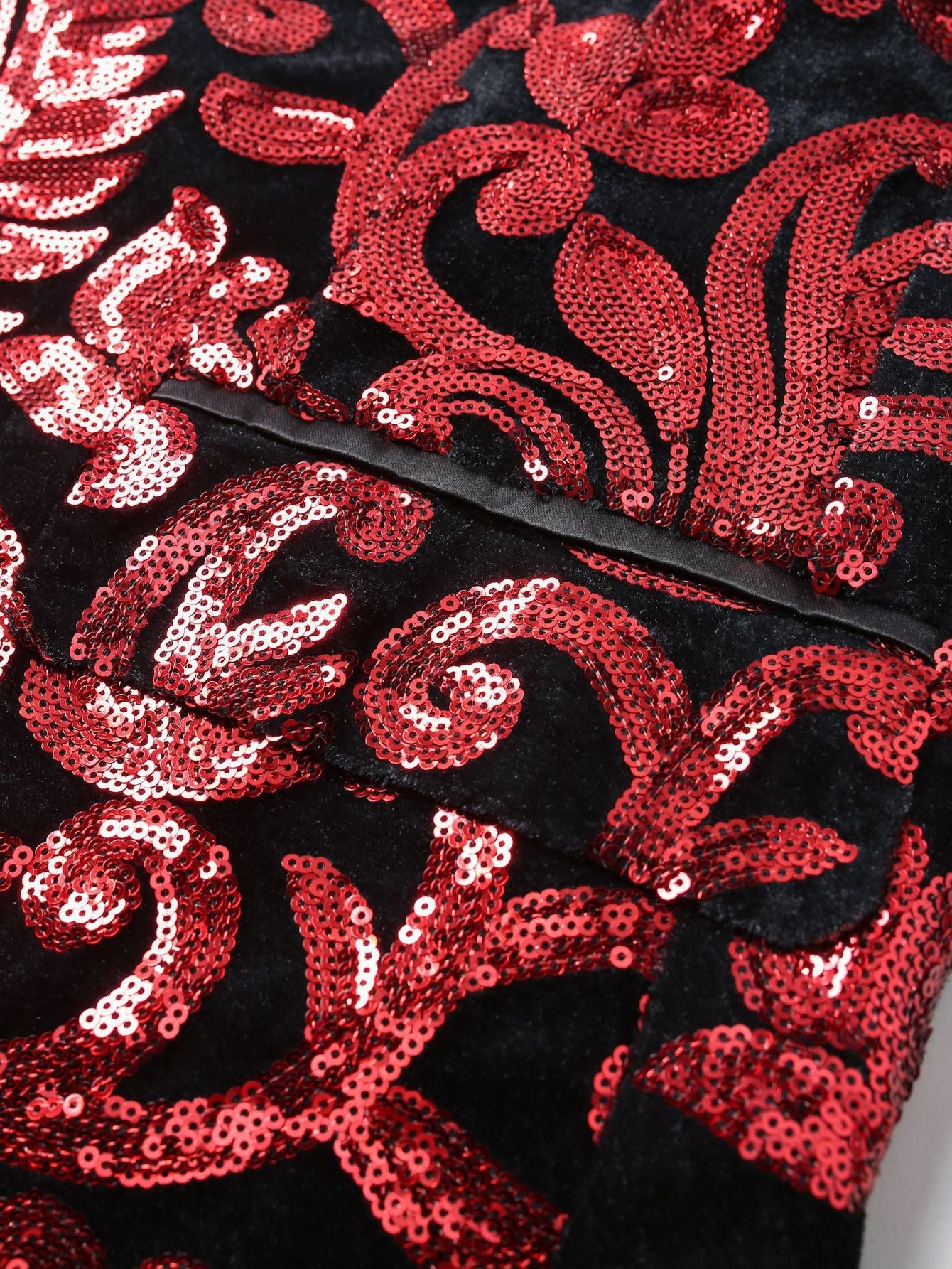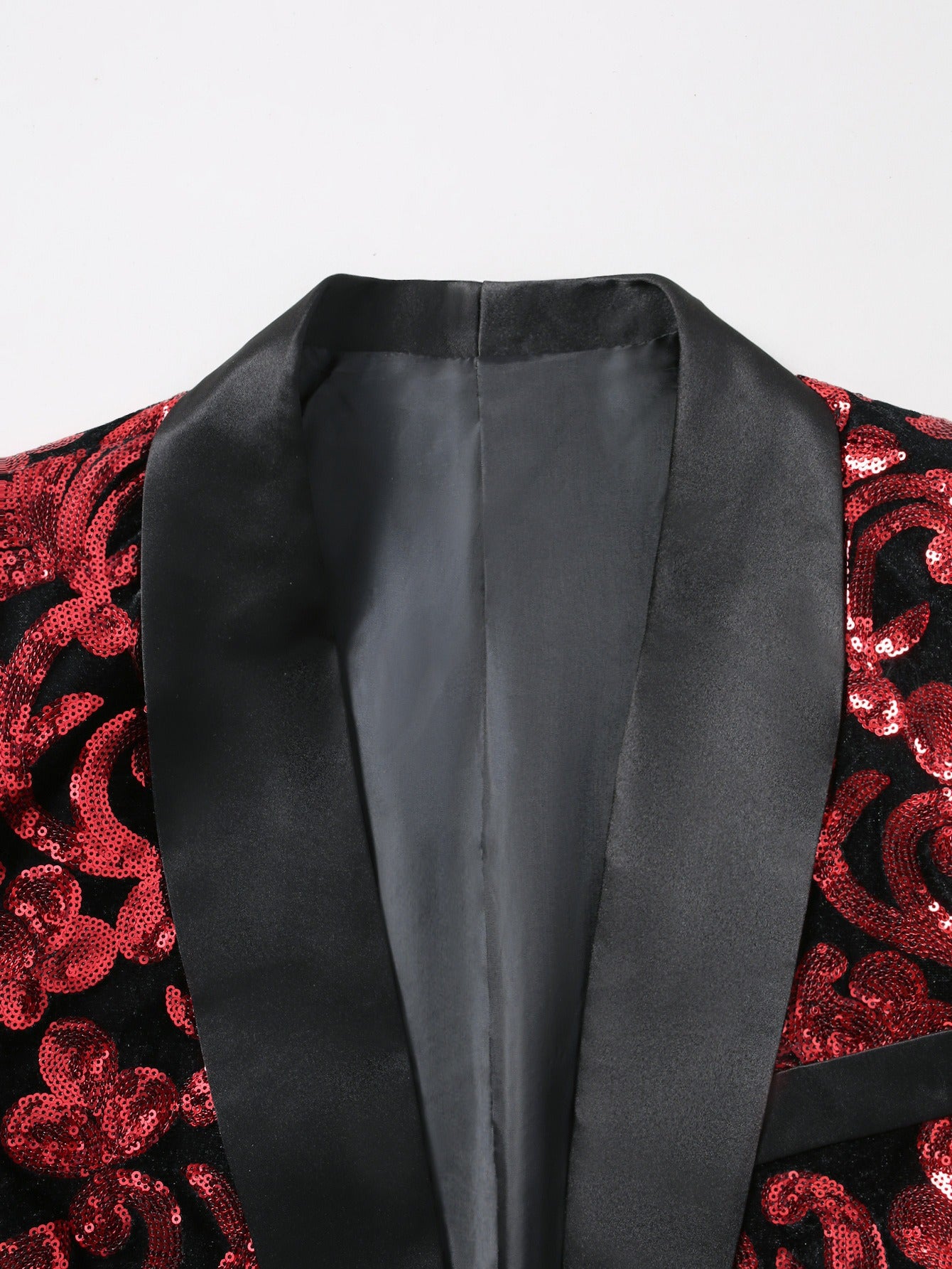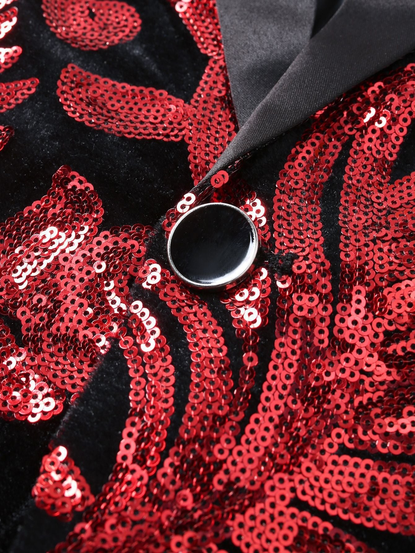 Dit Pailletten Smoking Jasje is gemaakt voor heren die een unieke en glamoureuze uitstraling zoeken voor formele feesten. Het jasje is deels bedekt met glimmende Pailletten die een opvallend Patroon vormen. De Smokingstijl kenmerkt zich door een nette reverskraag en een strakke pasvorm. Dit Heren Jasje is perfect voor gala's, evenementen of de feestdagen.