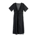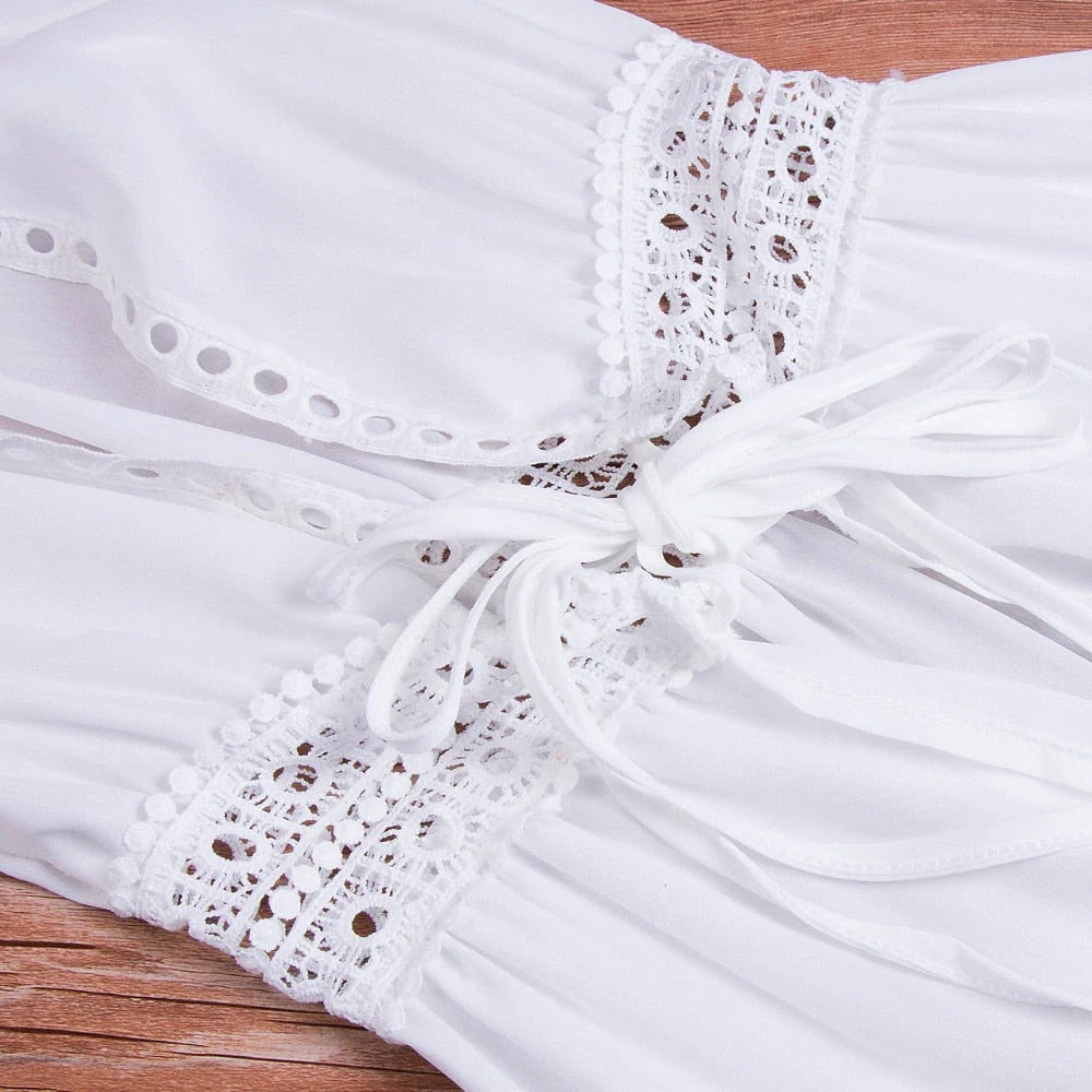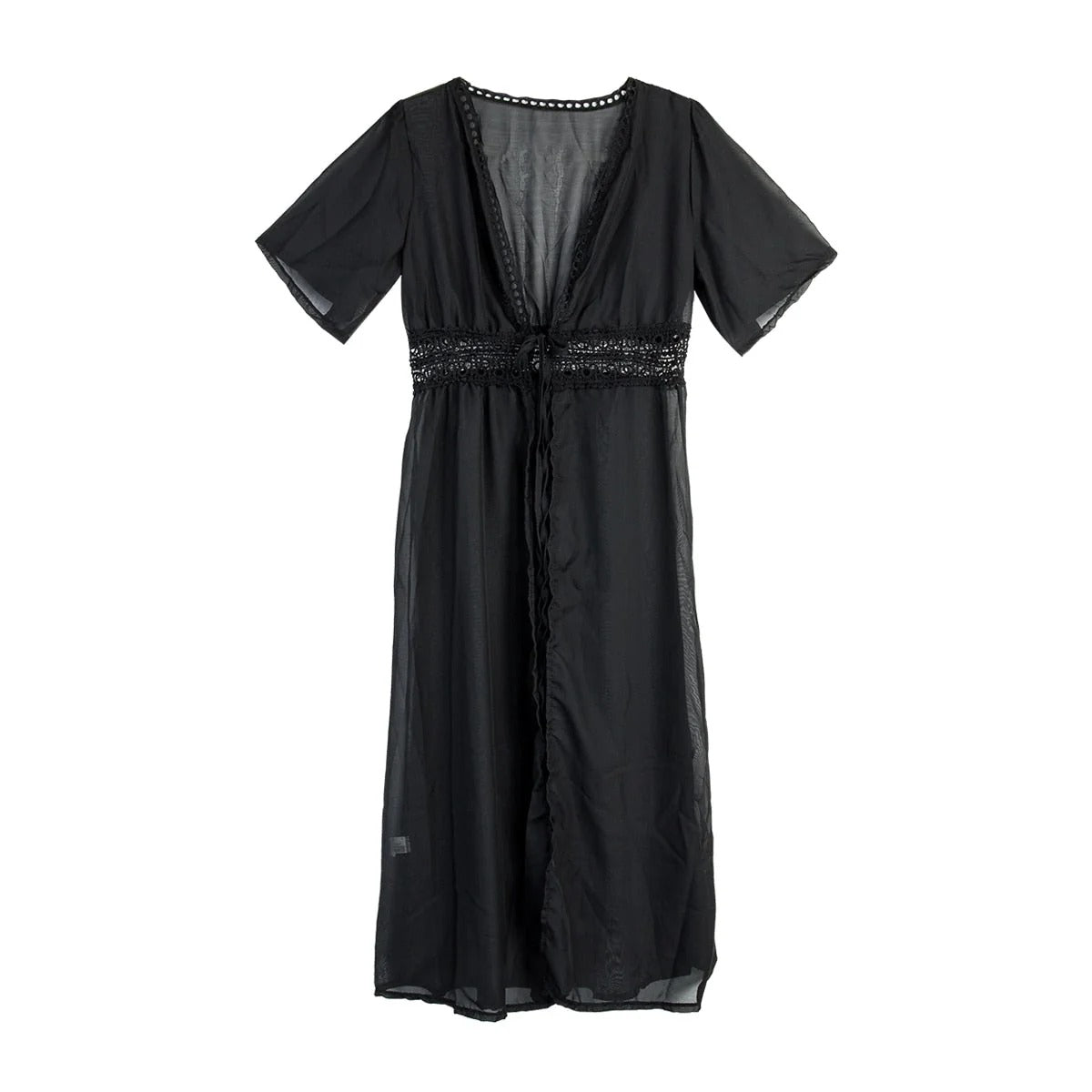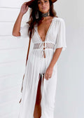 Deze lange strandjurk is gemaakt van een dunne, luchtige stof waar je een beetje doorheen kunt kijken. De jurk heeft een diepe V-hals en een mooie rand van kant in de taille, met touwtjes die je aan de voorkant kunt vaststrikken.
