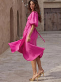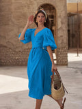 Deze v-hals wrap jurk voor dames is een elegante keuze voor zonnige dagen en vakanties. Het kledingstuk heeft een flatterende overslag bij de halslijn en opvallende pofmouwen met elastische boorden, wat zorgt voor een vrouwelijk volume en een speels silhouet. Dankzij de bijpassende strikceintuur in de taille kun je de pasvorm eenvoudig naar eigen wens accentueren, terwijl de rok soepel om je benen beweegt voor extra bewegingsvrijheid. Het materiaal heeft een textuur die een verzorgde uitstraling biedt tijdens warme middagen. De jurk valt tot op de kuit en combineert moeiteloos met verschillende accessoires voor een complete zomerse stijl. Dit product is ideaal voor strandwandelingen, vakanties en informele zomerfeesten.