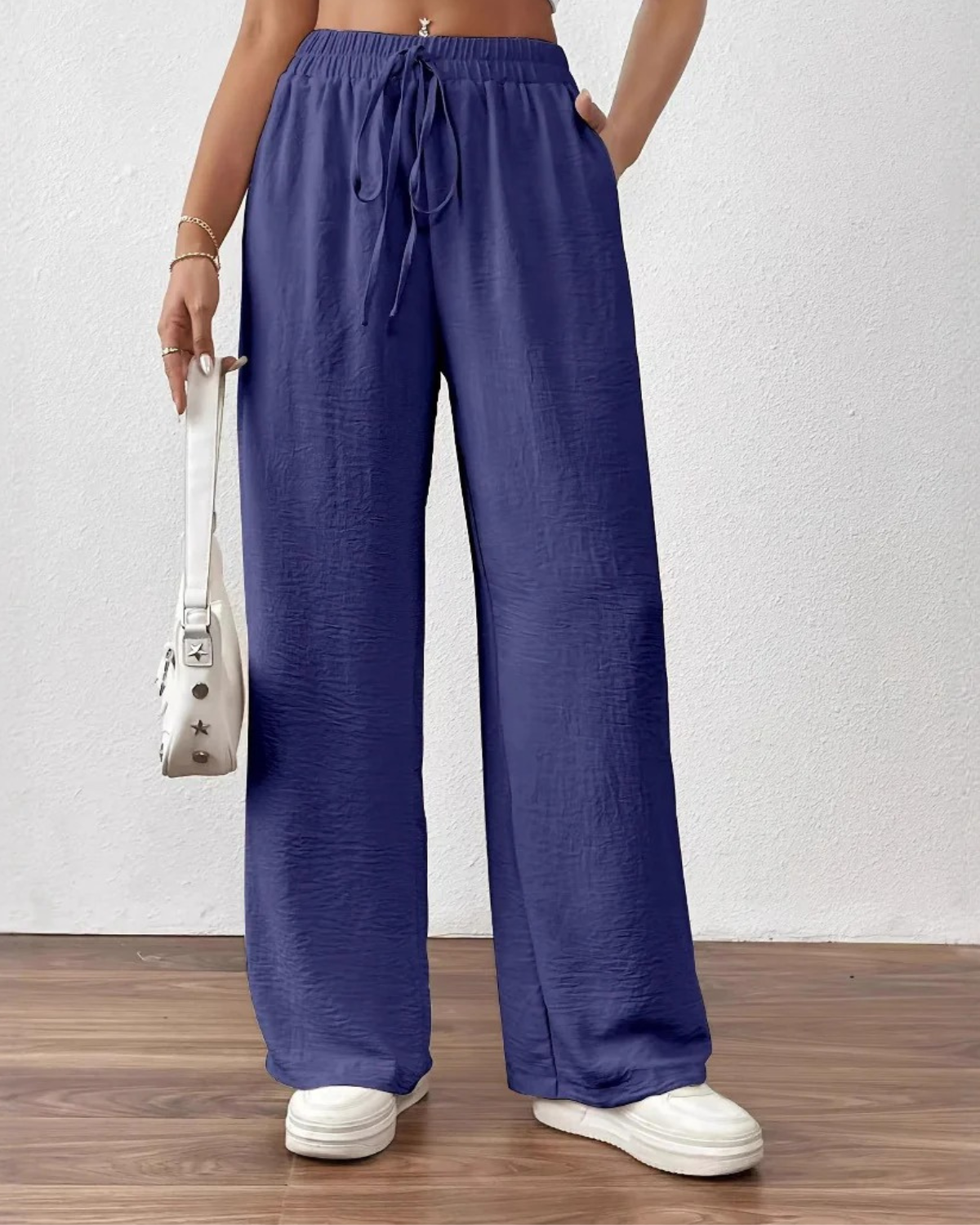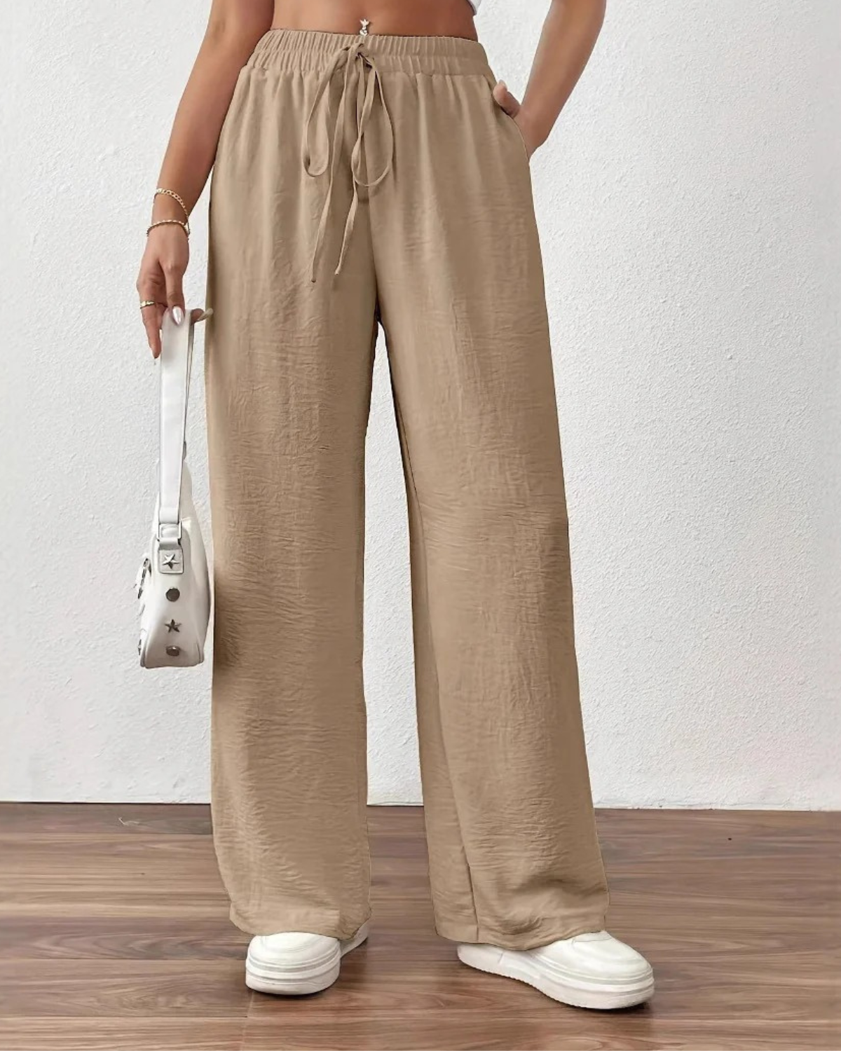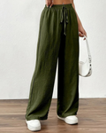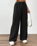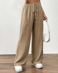 Deze dames zomerbroek met elastische taille zorgt voor een elegante en ontspannen pasvorm op warme dagen. De aangename hoge taille met een brede elastische band en een functioneel trekkoord zorgen ervoor dat de pasvorm naar wens aangepast kan worden. De broek heeft extra wijde pijpen die voor een luchtig gevoel en een modern silhouet zorgen dat moeiteloos meebeweegt bij elke stap. Dankzij de minimalistische stijl en praktische zijzakken creΓ«er je gemakkelijk een veelzijdige verschijning die perfect is voor strandvakanties, een middag in de stad of een informele bijeenkomst.