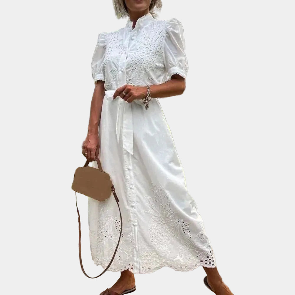 Volume in de mouwen: De pofmouwen geven de jurk een duidelijke vorm bij de schouders.